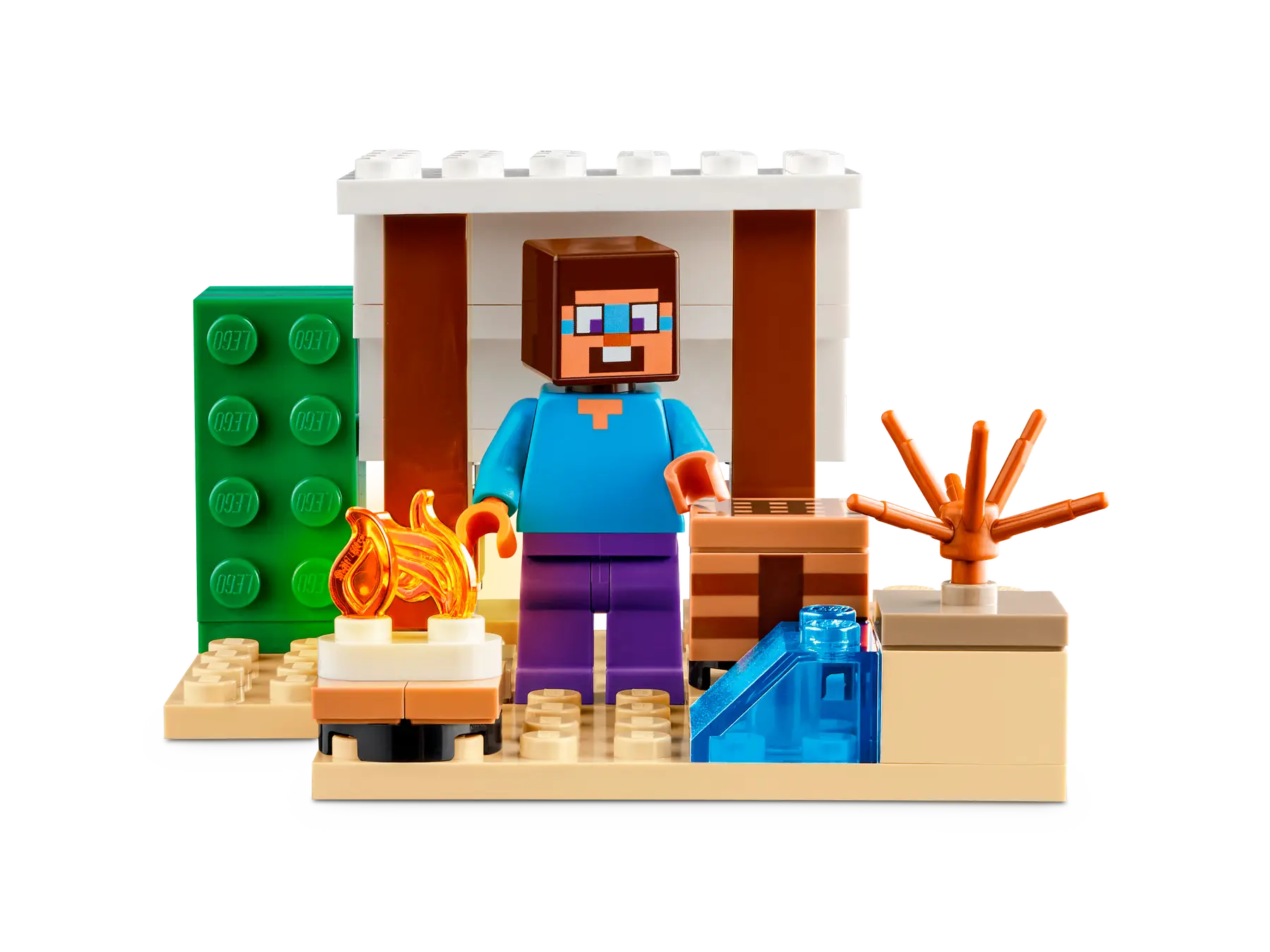 Este regalo para niños y niñas de 6 años o más, reconfigurable y basado en el juego de interpretación, contiene 3 figuras LEGO Minecraft (entre ellas Steve) y una cabaña Minecraft en el bioma Desierto. El set cuenta con icónicos objetos Minecraft, como una mesa de trabajo, una fogata y elementos típicos de un paisaje desértico. Sensacional para fans de Minecraft, inspirará creativas aventuras y emocionantes batallas contra un fantasma volador con alas móviles que ataca la base. Steve tiene una expresión facial actualizada y, por primera vez en un set LEGO Minecraft, hay un camello bebé. Es compatible con otros juegos LEGO Minecraft (a la venta por separado).
